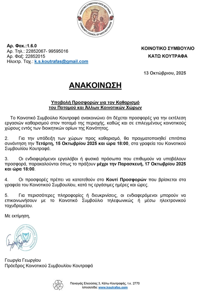 ΑΝΑΚΟΙΝΩΣΗ – Υποβολή Προσφορών για τον Καθαρισμό του Ποταμού και Άλλων Κοινοτικών Χώρων