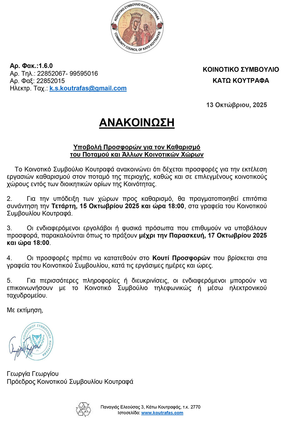 https://koutrafas.com/wp-content/uploads/logo-new.png00netinfohttps://koutrafas.com/wp-content/uploads/logo-new.pngnetinfo2025-10-13 12:15:532025-10-30 12:33:01ΑΝΑΚΟΙΝΩΣΗ – Υποβολή Προσφορών για τον Καθαρισμό του Ποταμού και Άλλων Κοινοτικών Χώρων